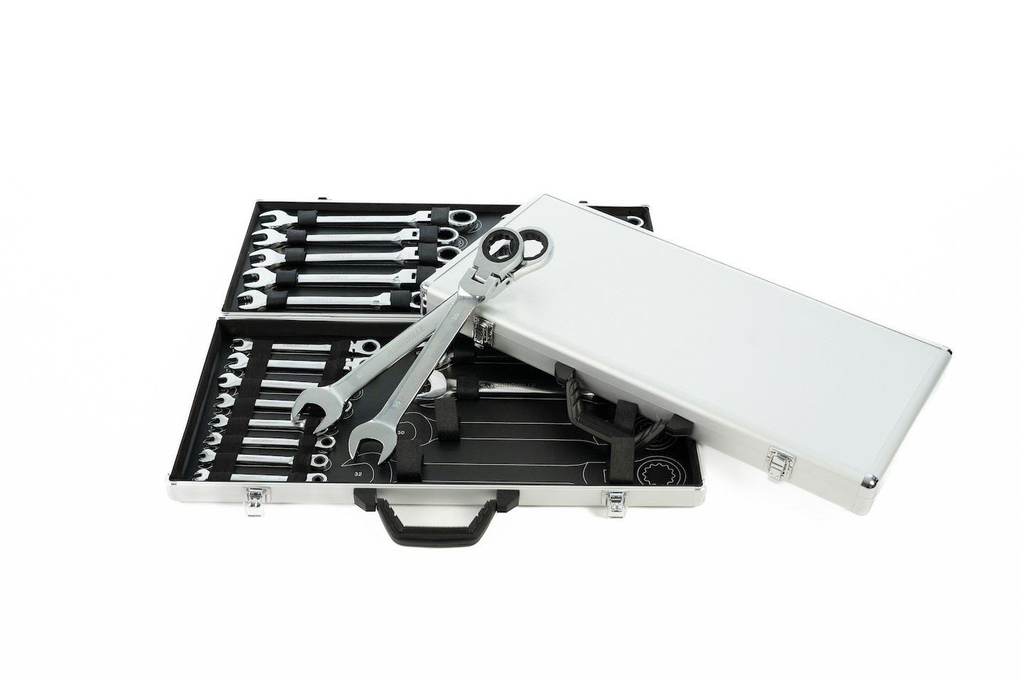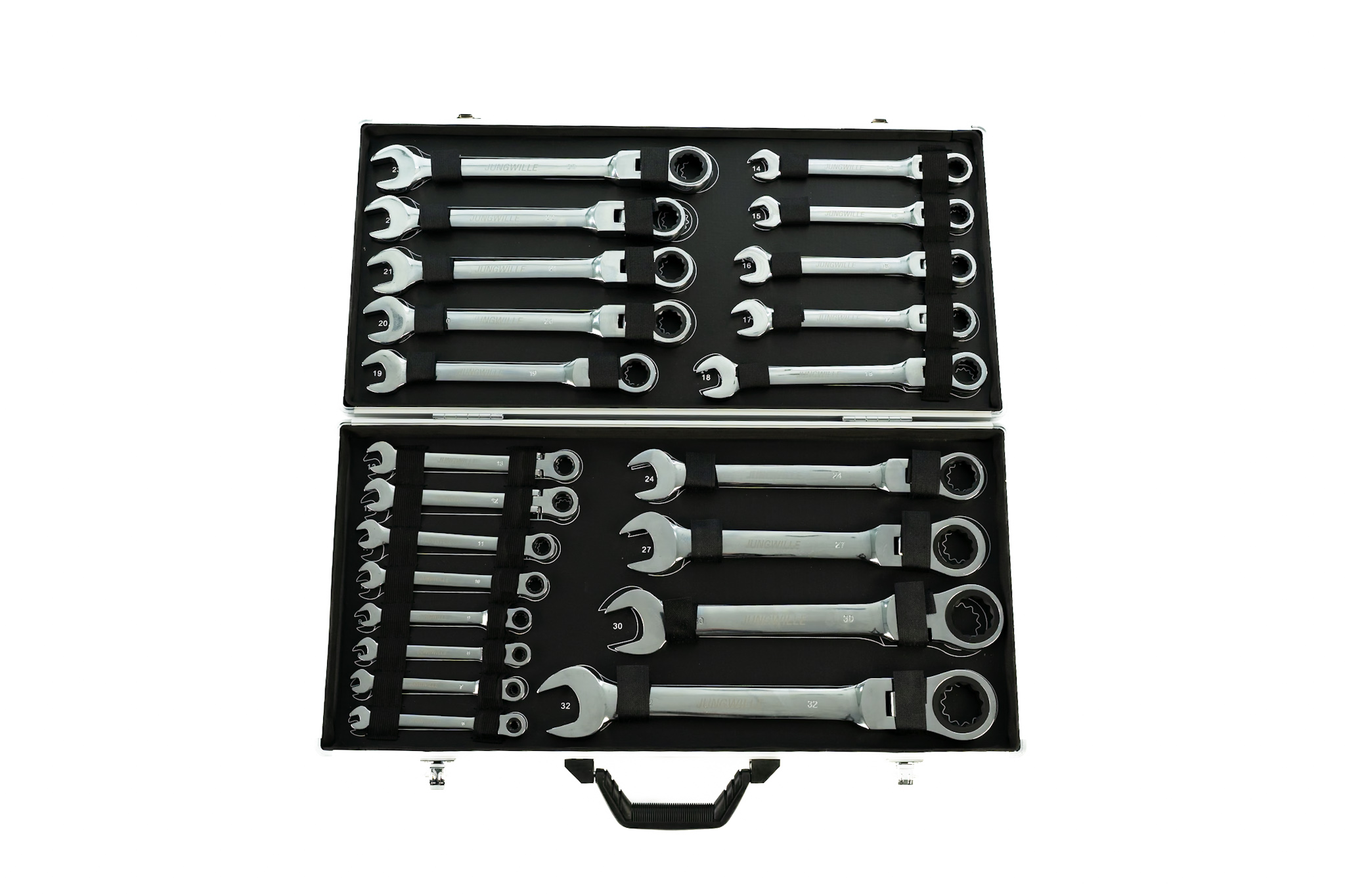 22-delige steeksleutelset met ratelkop voor snel en precies werken. Professionele kwaliteit, geleverd in stevige opbergkoffer.