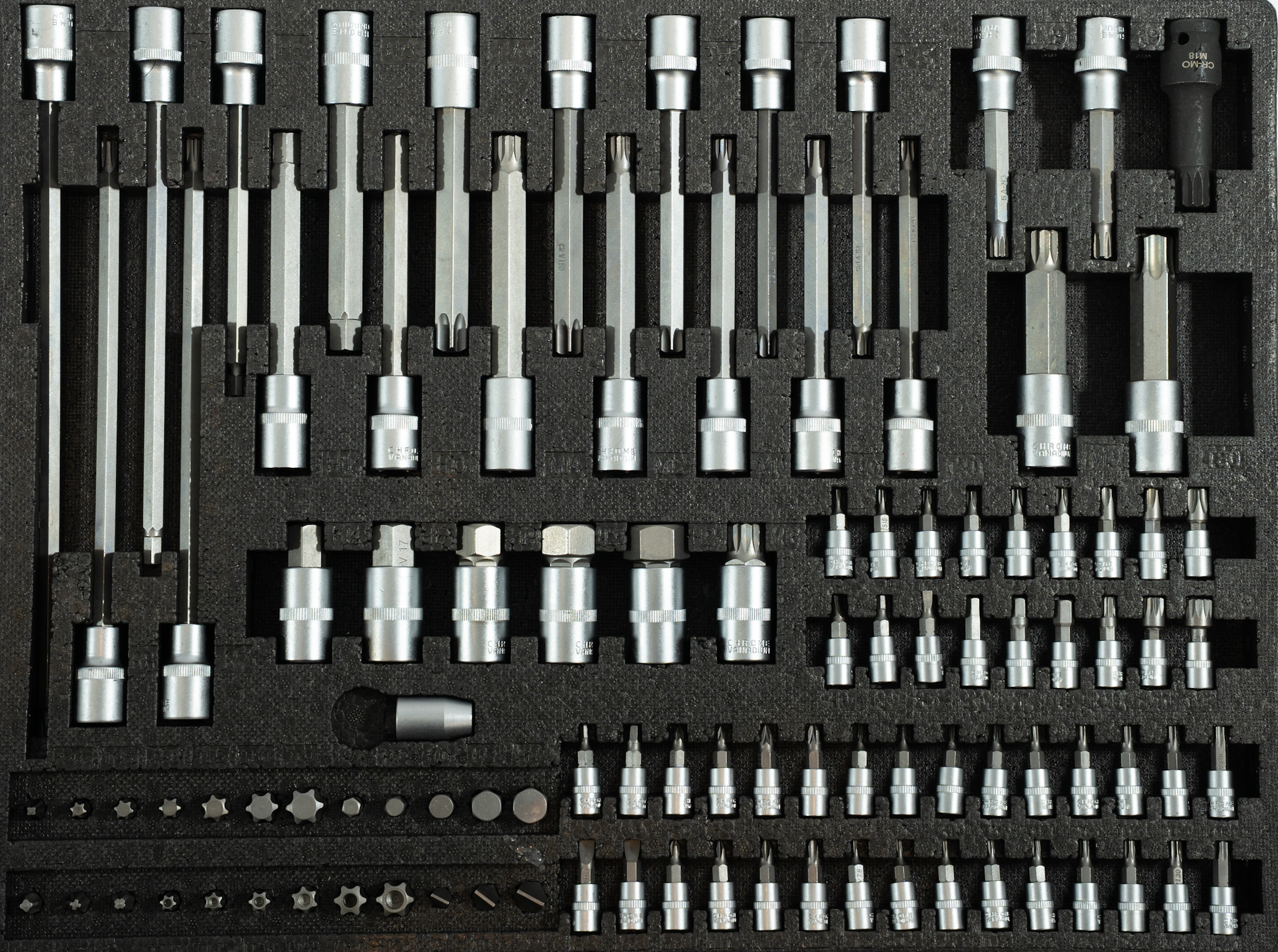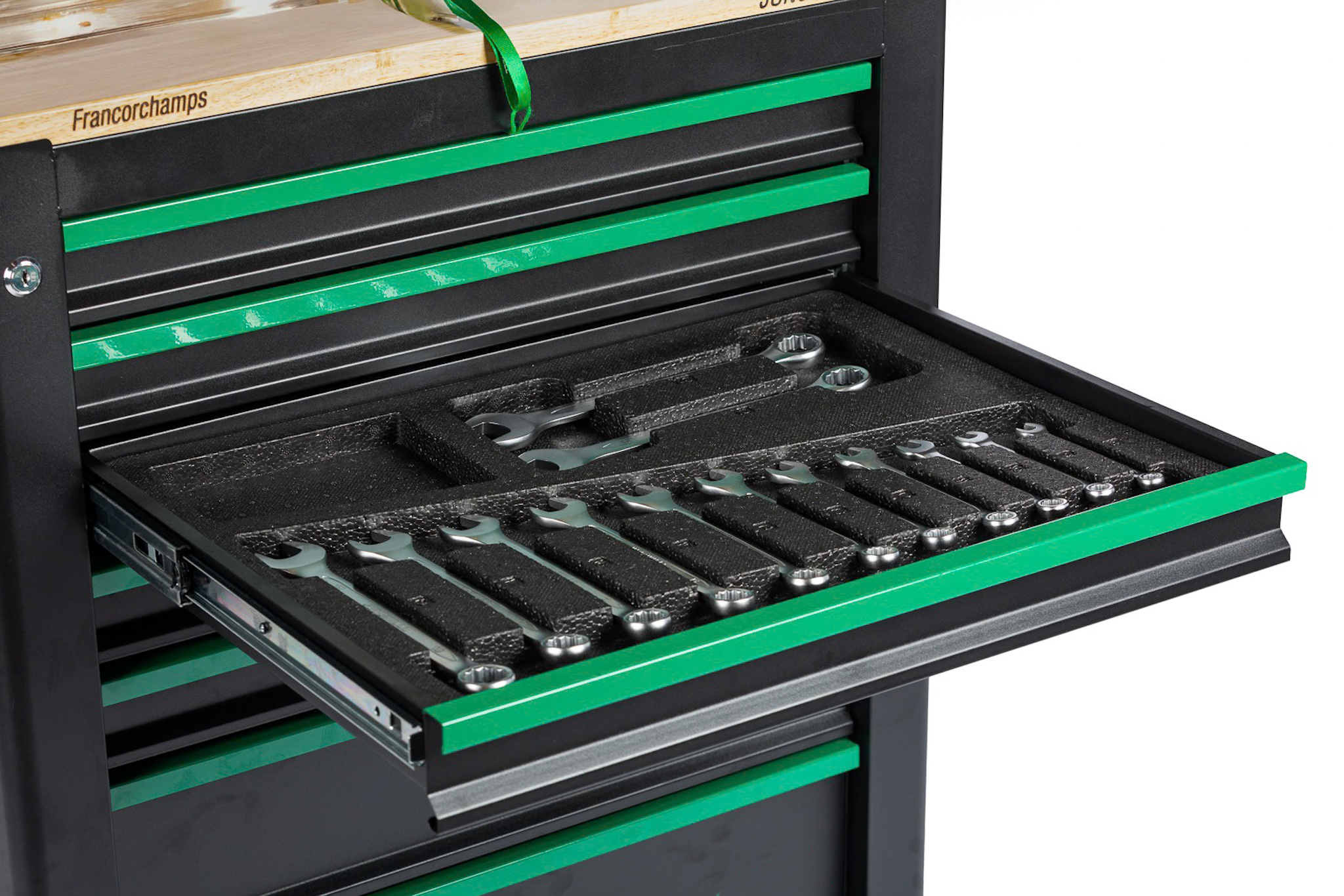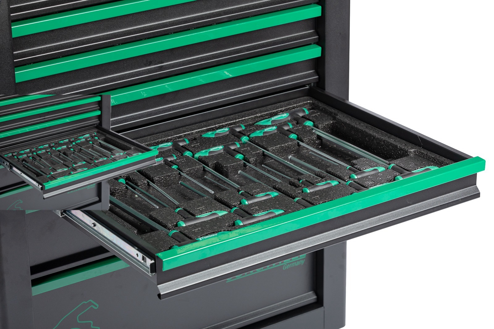 7 Schubladen mit Schaumeinlagen bieten eine geordnete und sichere Unterbringung von 251 Premium-Werkzeugen. Dank Vollauszug (100% Öffnung) ist jedes Werkzeug sofort griffbereit – langes Suchen entfällt.