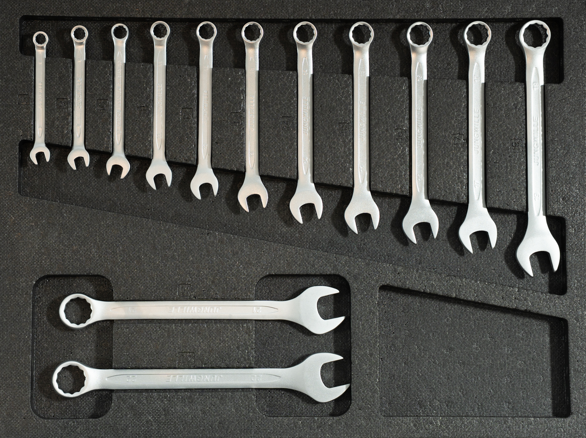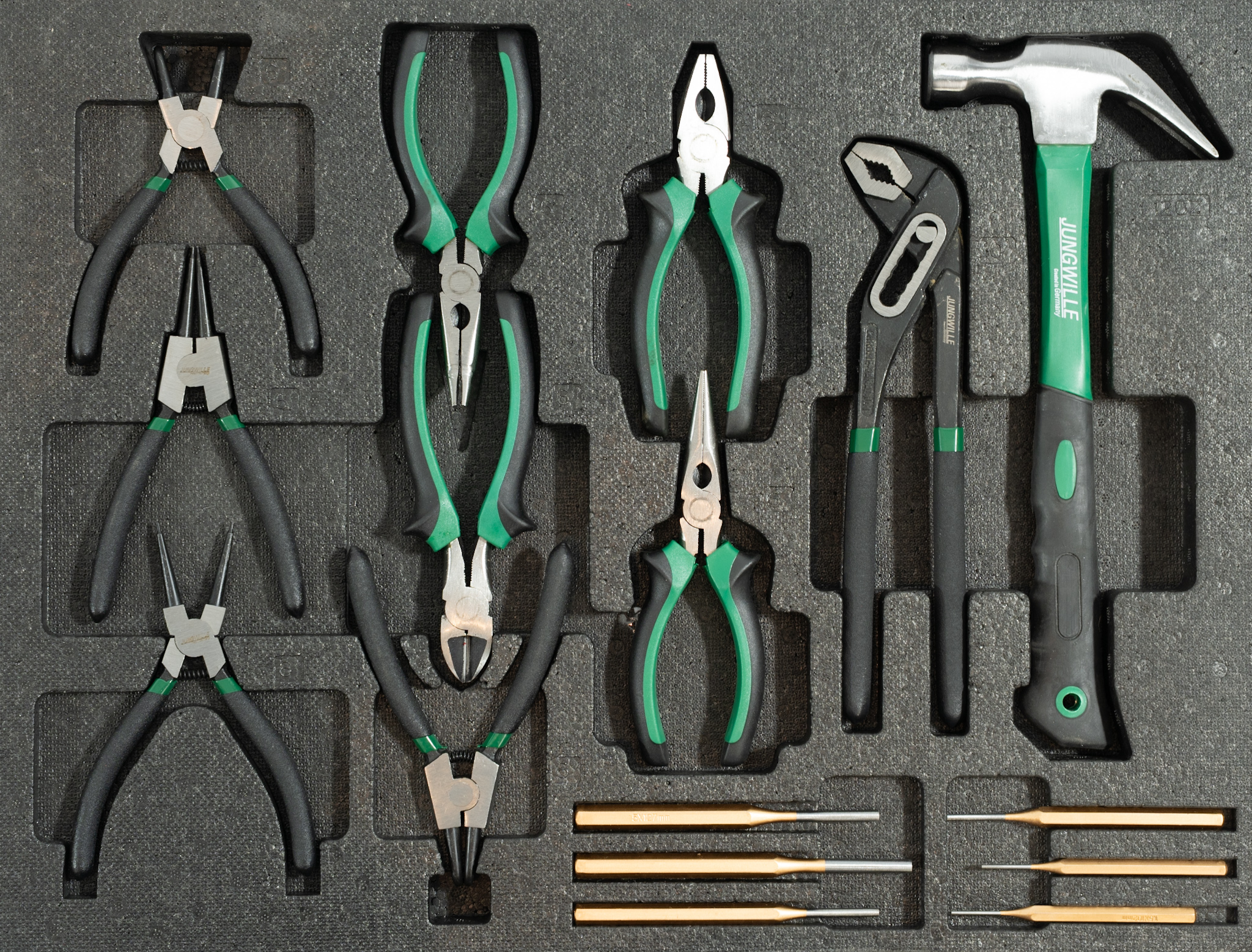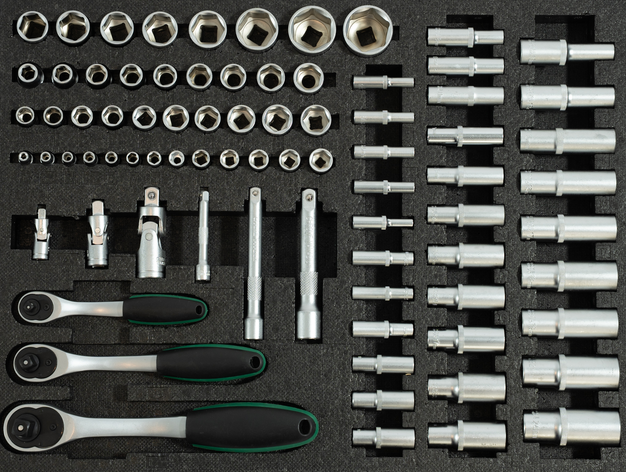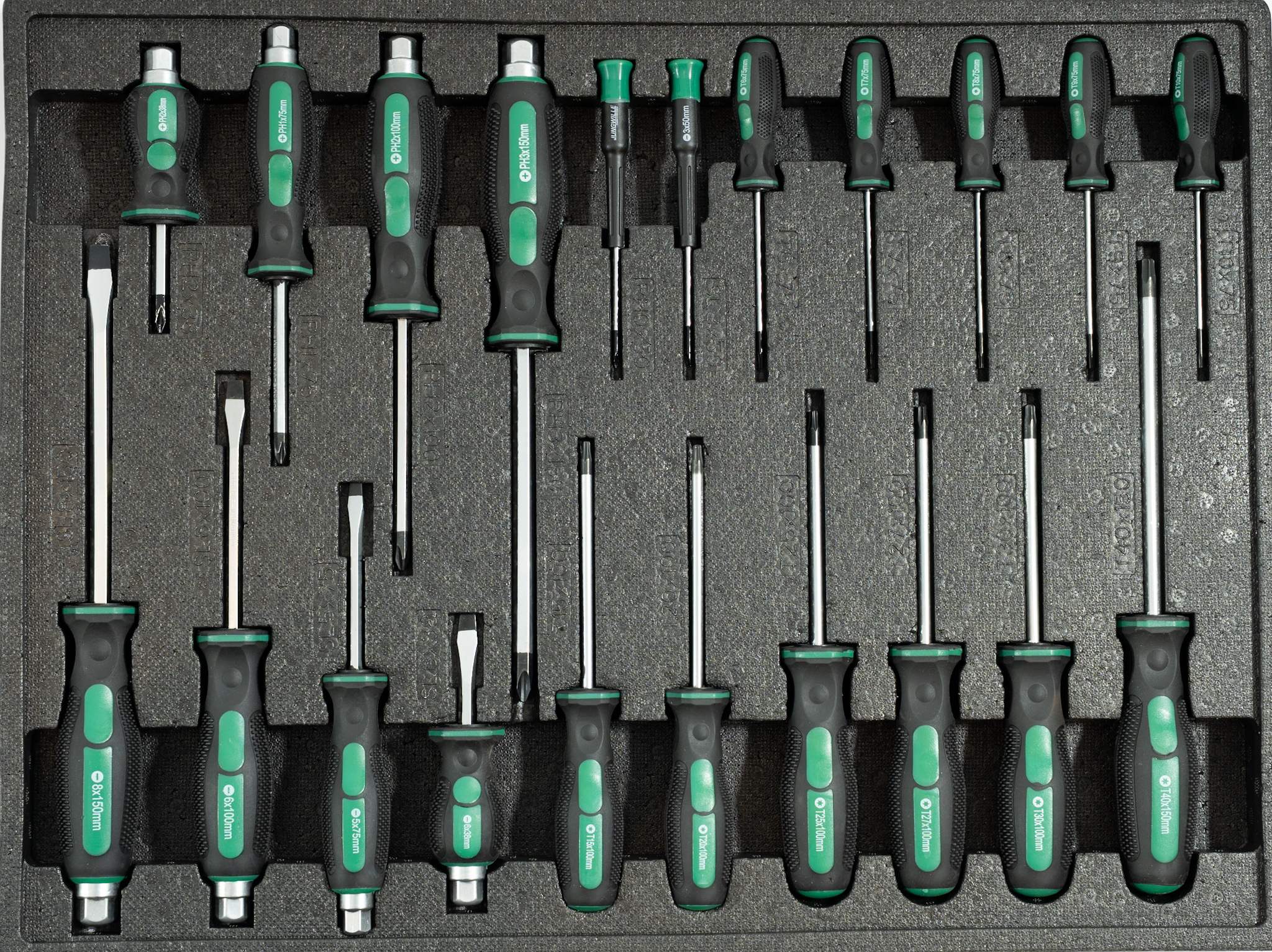 7 Schubladen mit Schaumeinlagen bieten eine geordnete und sichere Unterbringung von 251 Premium-Werkzeugen. Dank Vollauszug (100% Öffnung) ist jedes Werkzeug sofort griffbereit – langes Suchen entfällt.