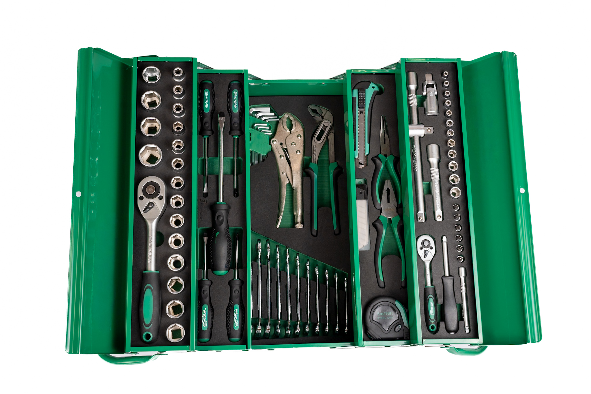 86-teiliges CR-V Werkzeugset im Metallkoffer: 1/2″ & 1/4″ Stecknüsse, zwei 45T-Umschaltknarren, Ringschlüssel, Zangen, Schraubendreher und Zubehör.